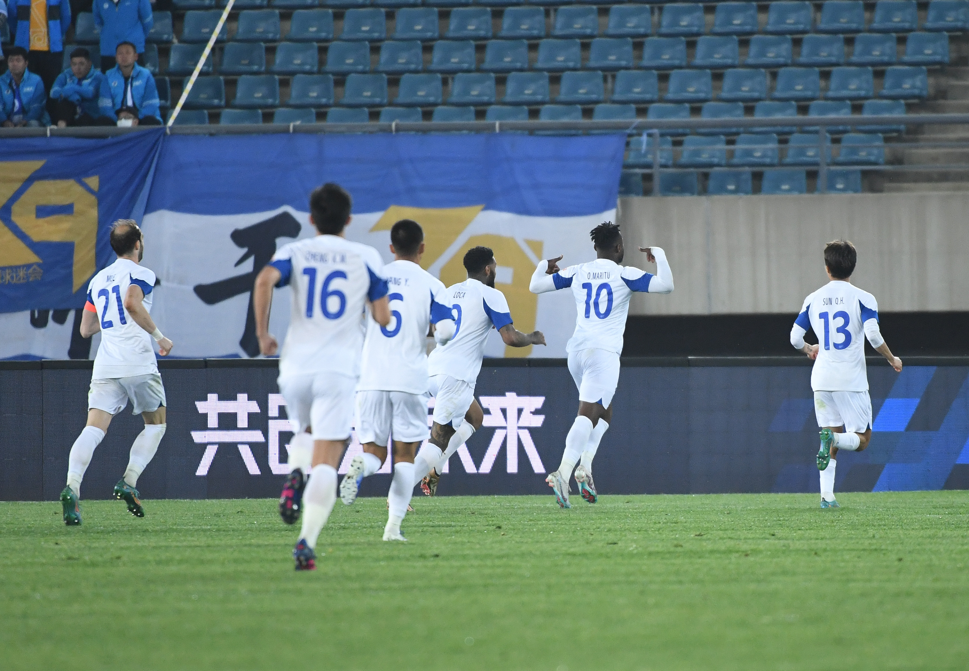 5月9日,沧州雄狮队球员奥斯卡(右二)在比赛中庆祝进球。新华社记者 龙雷 摄